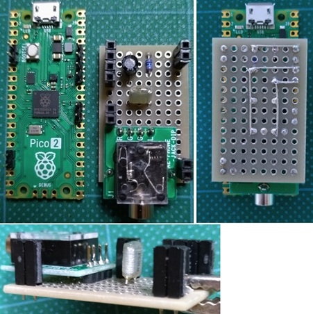 ステレオミニジャックの取り付けには、添付したイメージのようにピンヘッダ逆さにして取り付けるとおさまりが良いです。